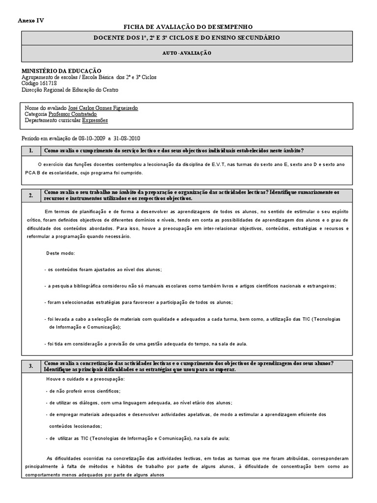 1. Como avalia o cumprimento do serviço lectivo e dos seus objectivos individuais estabelecidos neste âmbito?