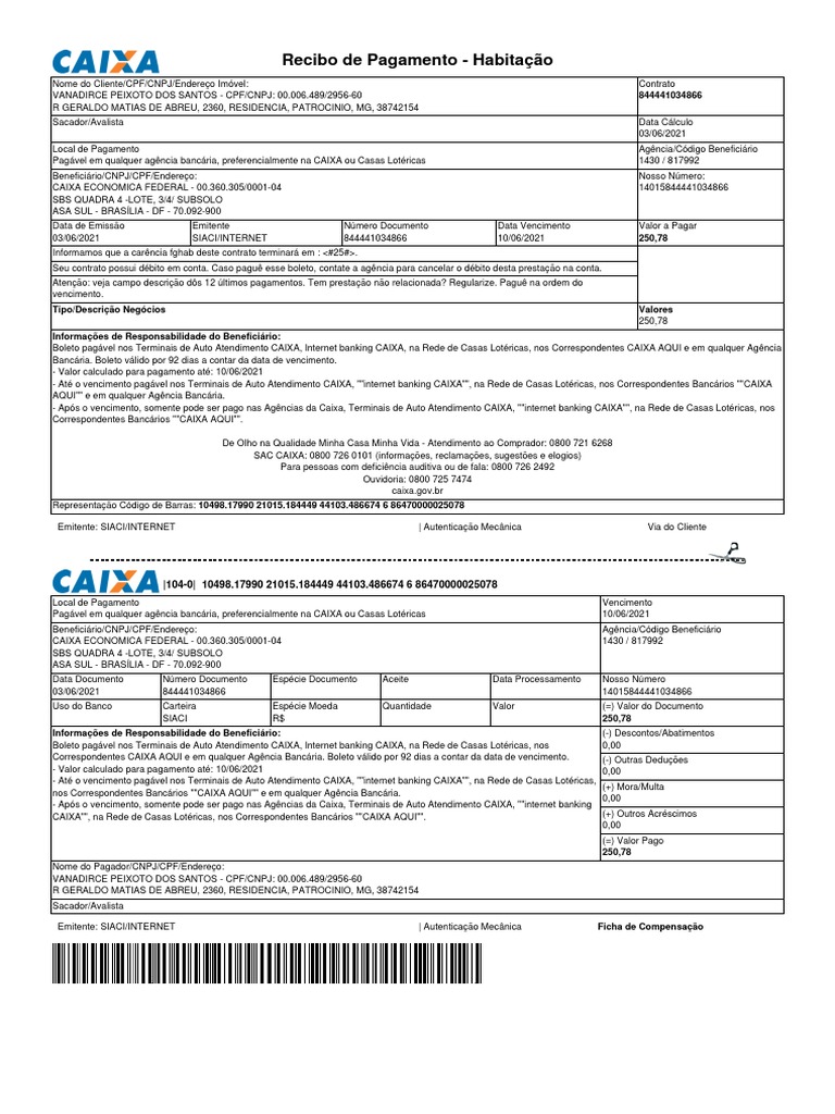 Pagável em qualquer agência bancária, preferencialmente na CAIXA ou Casas Lotéricas 10/06/2021