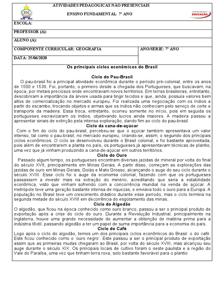 COMPONENTE CURRICULAR: GEOGRAFIA ANO/SÉRIE: 7º ANO