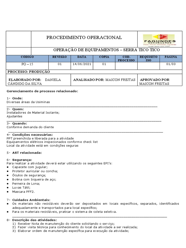TÍTULO: PO- 15 OPERAÇÃO DE EQUIPAMENTOS – SERRA TICO TICO REVISÃO: 01 PÁGINA: