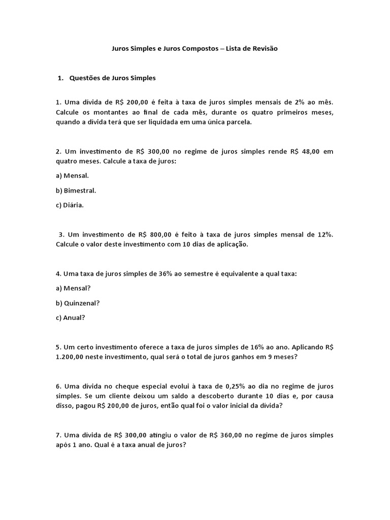 1. Uma dívida de R$ 200,00 é feita à taxa de juros simples mensais de 2% ao mês.
