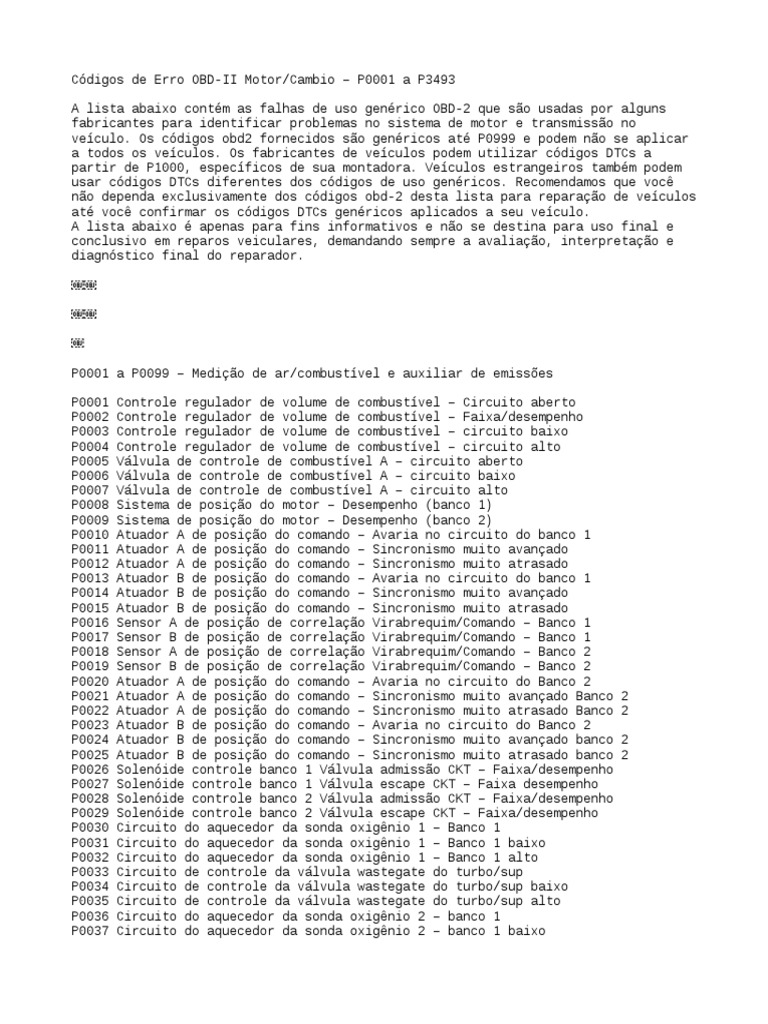 não dependa exclusivamente dos códigos obd-2 desta lista para reparação de veículos