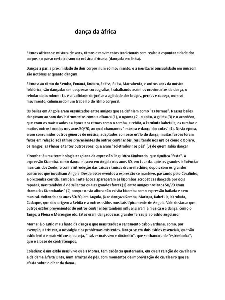 Ritmos: ao ritmo do Semba, Funaná, Kuduro, Sakiss, Puita, Marrabenta, e outros sons da música