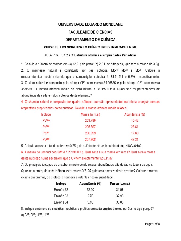 4. O chumbo natural é composto por quatro isótopos que são apresentados na tabela a seguir com as