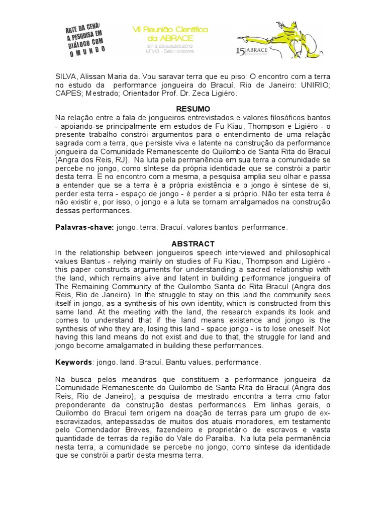 Keywords: jongo. land. Bracuí. Bantu values. performance.