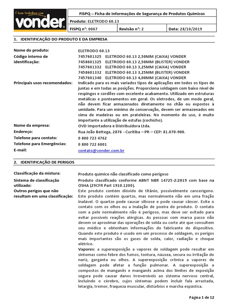 FISPQ n°: 0067 Revisão n°: 2 Data: 28/10/2019
