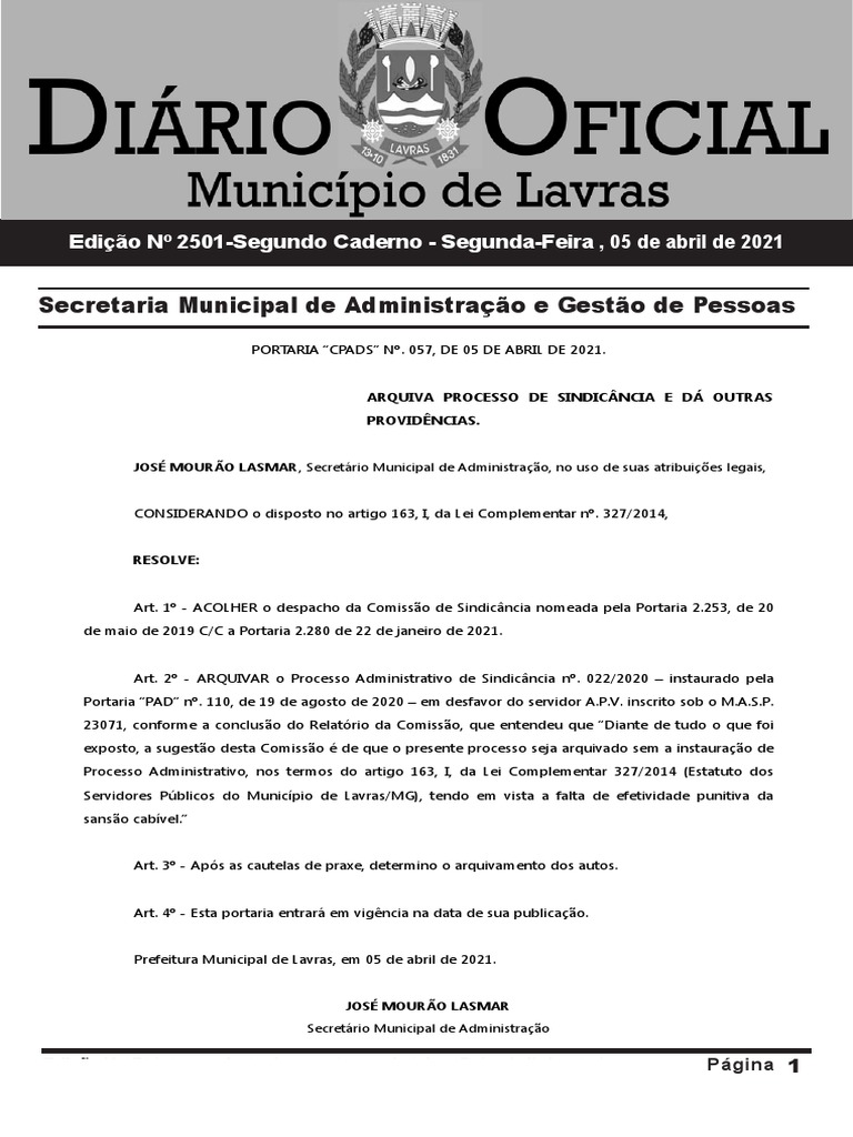 Prefeitura Municipal de Lavras, em 05 de abril de 2021.