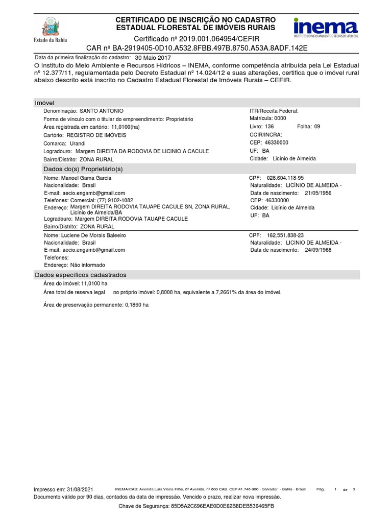 Impresso em: 31/08/2021 INEMA/CAB: Avenida Luís Viana Filho, 6ª Avenida, nº 600 CAB. CEP:41.746-900 - Salvador - Bahia - Brasil Pág. 1 de 3