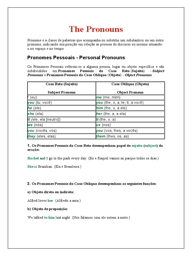Pronouns e Pronomes Pessoais do Caso Oblíquo (Objeto) - Object Pronouns.