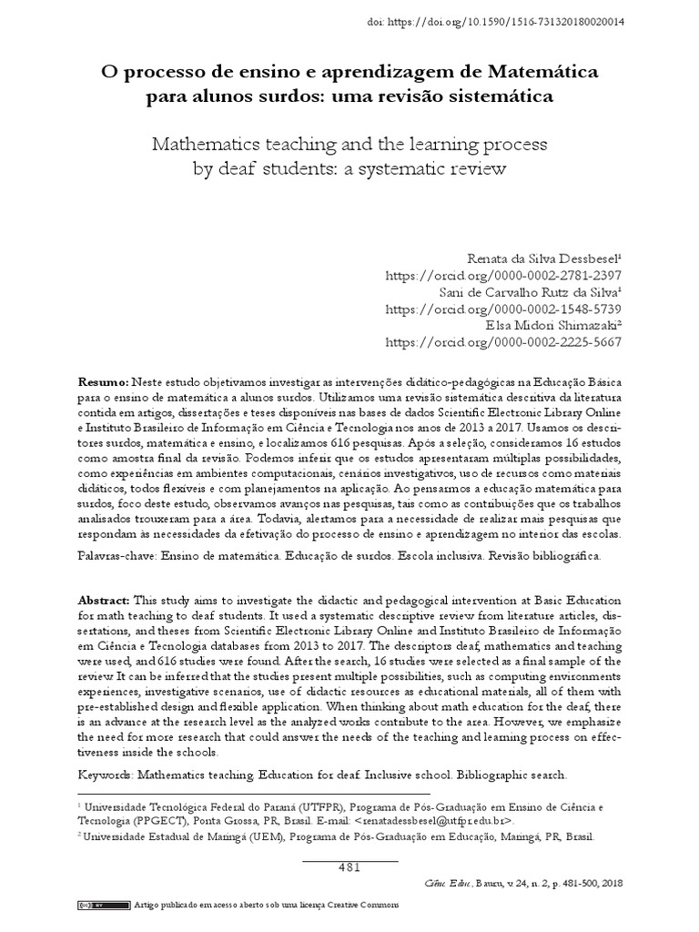 em Ciência e Tecnologia databases from 2013 to 2017. The descriptors deaf, mathematics and teaching