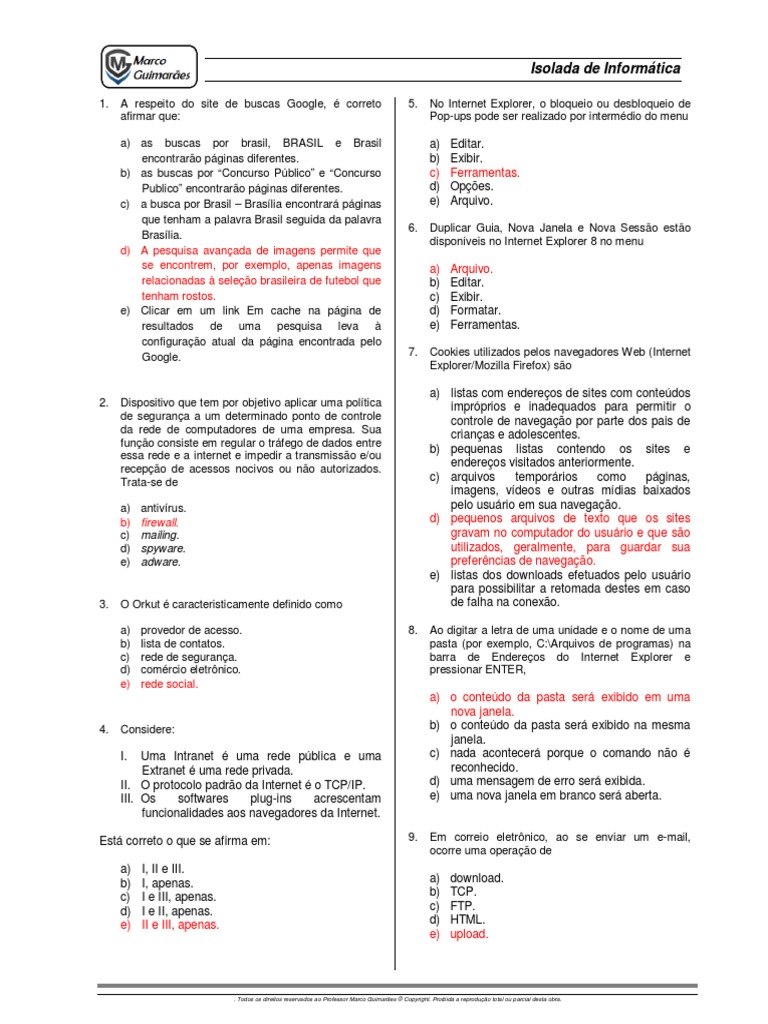 1. A respeito do site de buscas Google, é correto 5. No Internet Explorer, o bloqueio ou desbloqueio de