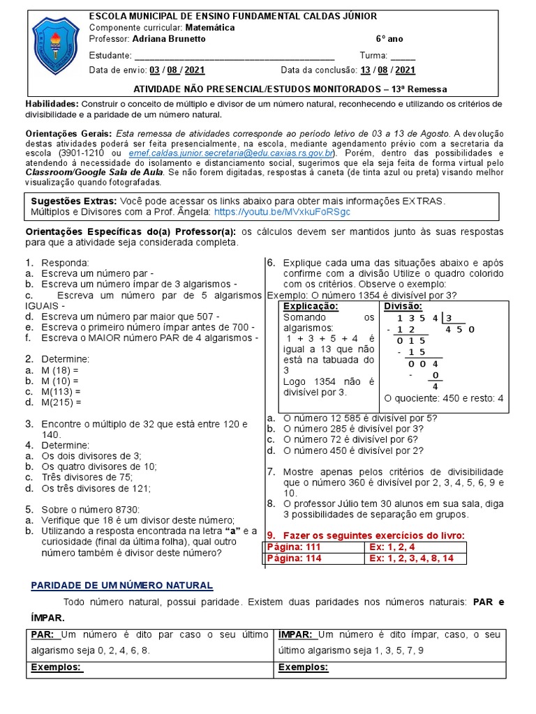 Habilidades: Construir o conceito de múltiplo e divisor de um número natural, reconhecendo e utilizando os critérios de