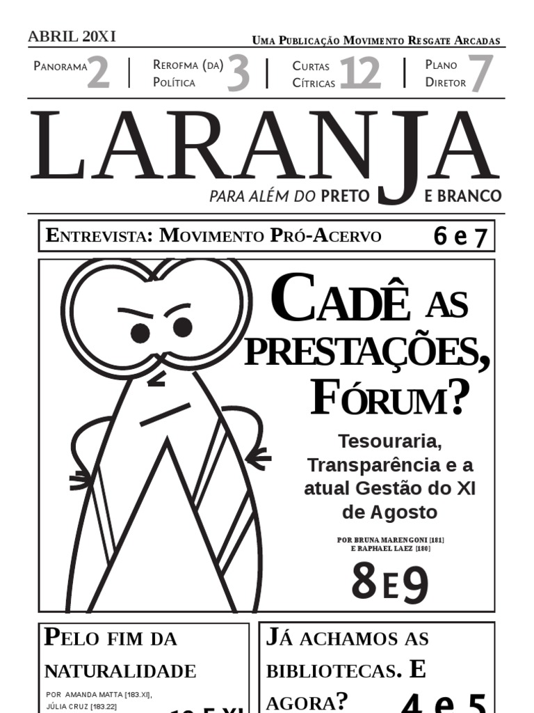 está sendo feito pela Diretoria e pelo nos- so Centro Acadêmico? Qual a situação atual do acervo? Com uma entrevista ao movimento pró-acervo, o Laranja busca esclarecer essas questões, e levar o aluno