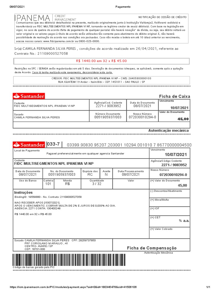 Sacado CAMILA FERNANDA SILVA PERES CPF: 28259737850