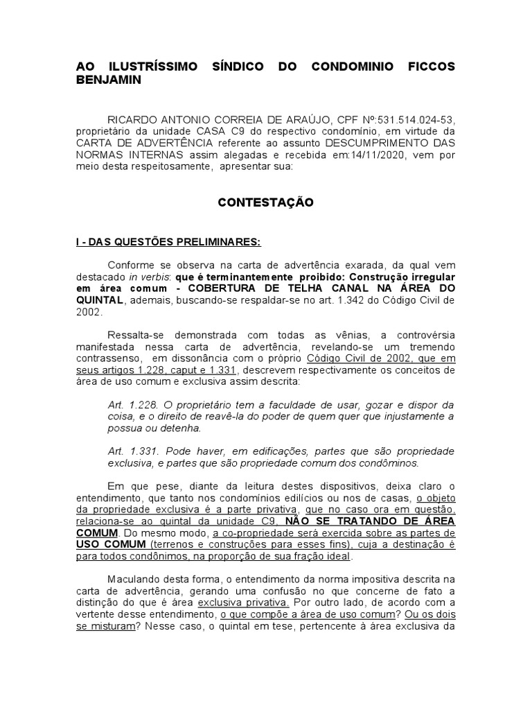 objeto em questão. Em outras palavras, o próprio Condomínio agiu em