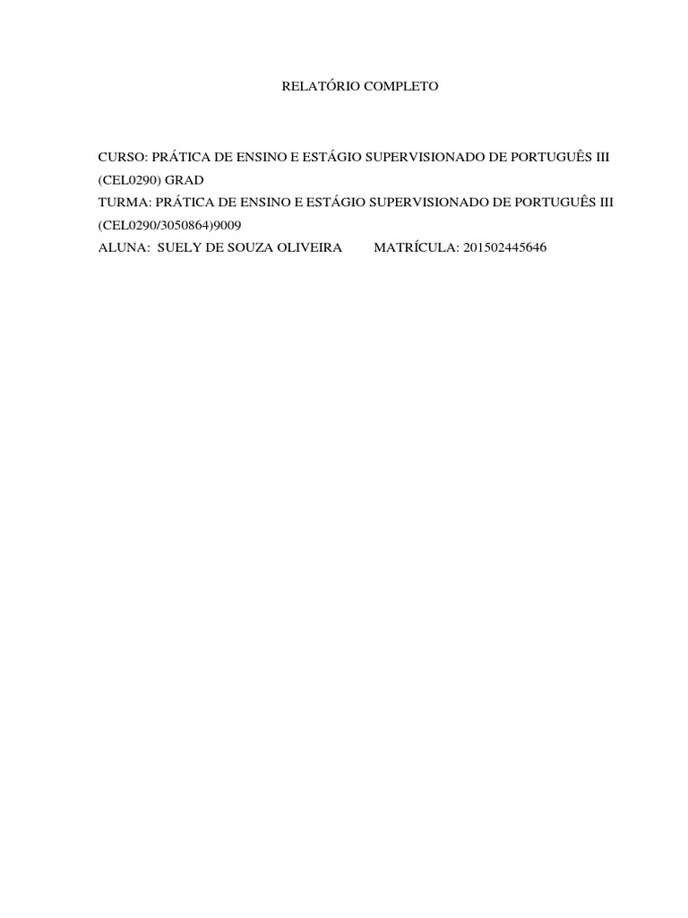 Este é um Relatório do Curso de Letras da aluna: Suely de Souza Oliveira,