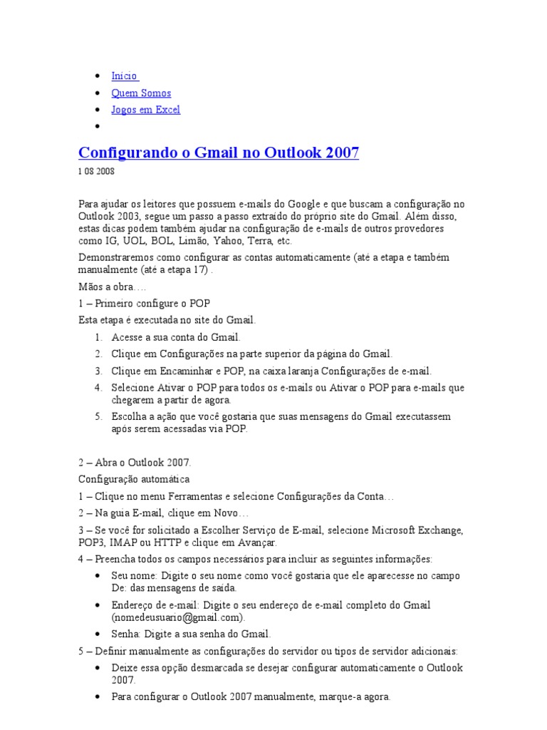 Outlook 2003, segue um passo a passo extraído do próprio site do Gmail. Além disso,