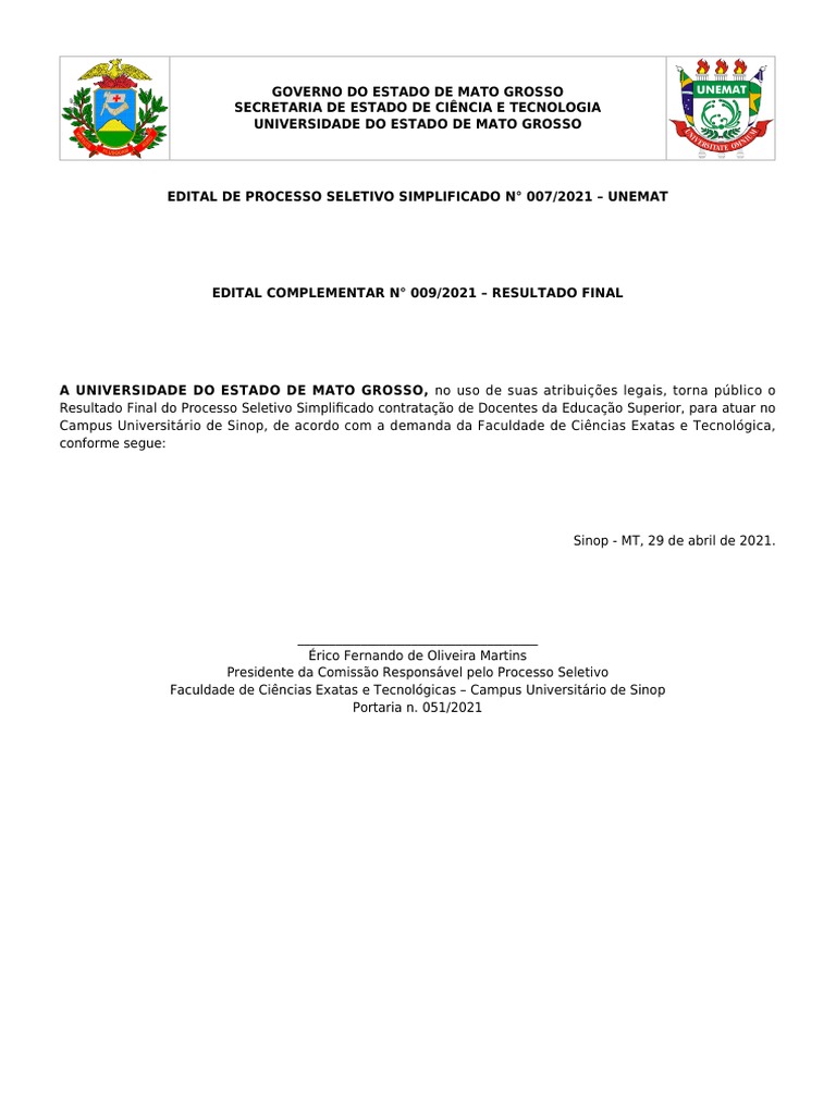 Seletivo: Edital nº 007/2021-UNEMAT: Campus de Sinop - FACET