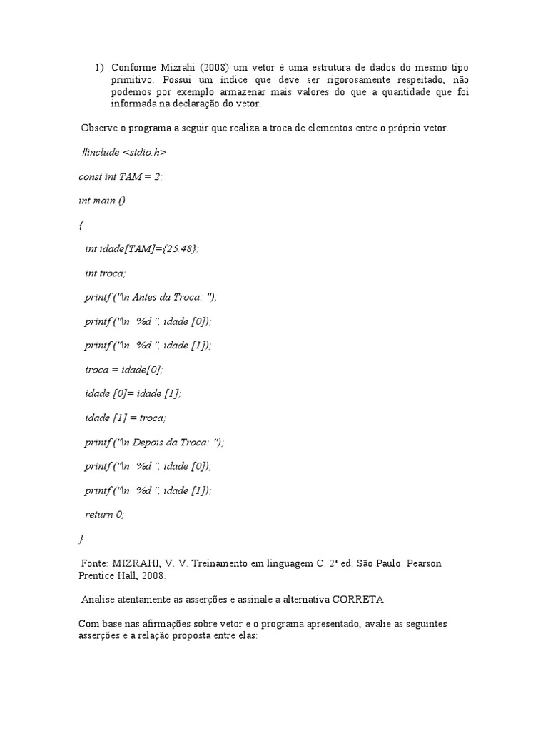 1) Conforme Mizrahi (2008) um vetor é uma estrutura de dados do mesmo tipo