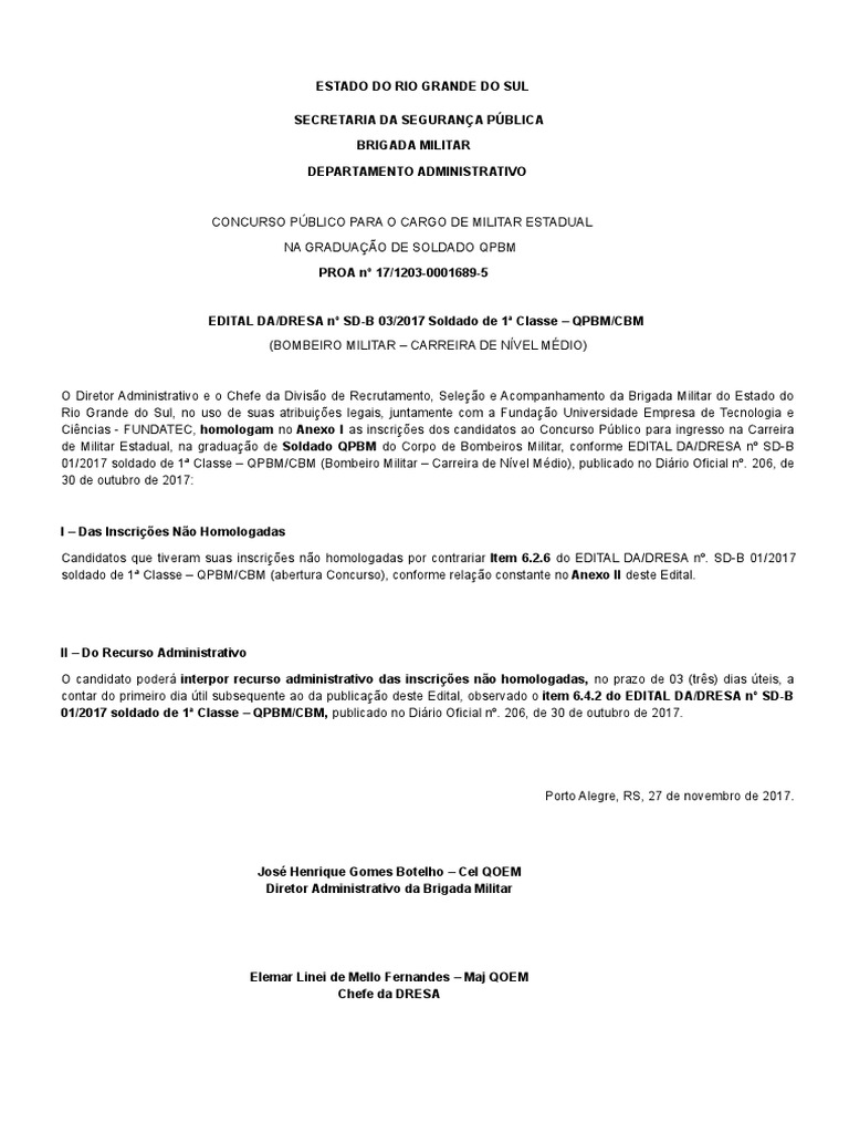 01/2017 soldado de 1ª Classe – QPBM/CBM (Bombeiro Militar – Carreira de Nível Médio), publicado no Diário Oficial nº. 206, de