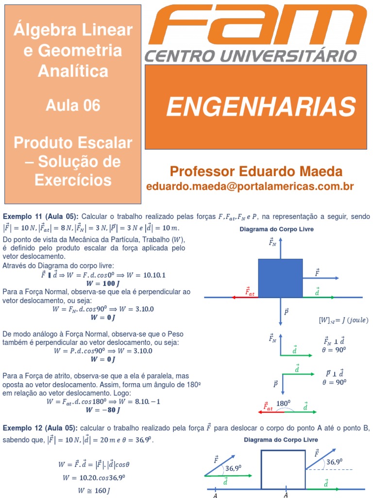 Exemplo 12 (Aula 05): calcular o trabalho realizado pela força 𝐹Ԧ para deslocar o corpo do ponto A até o ponto B,