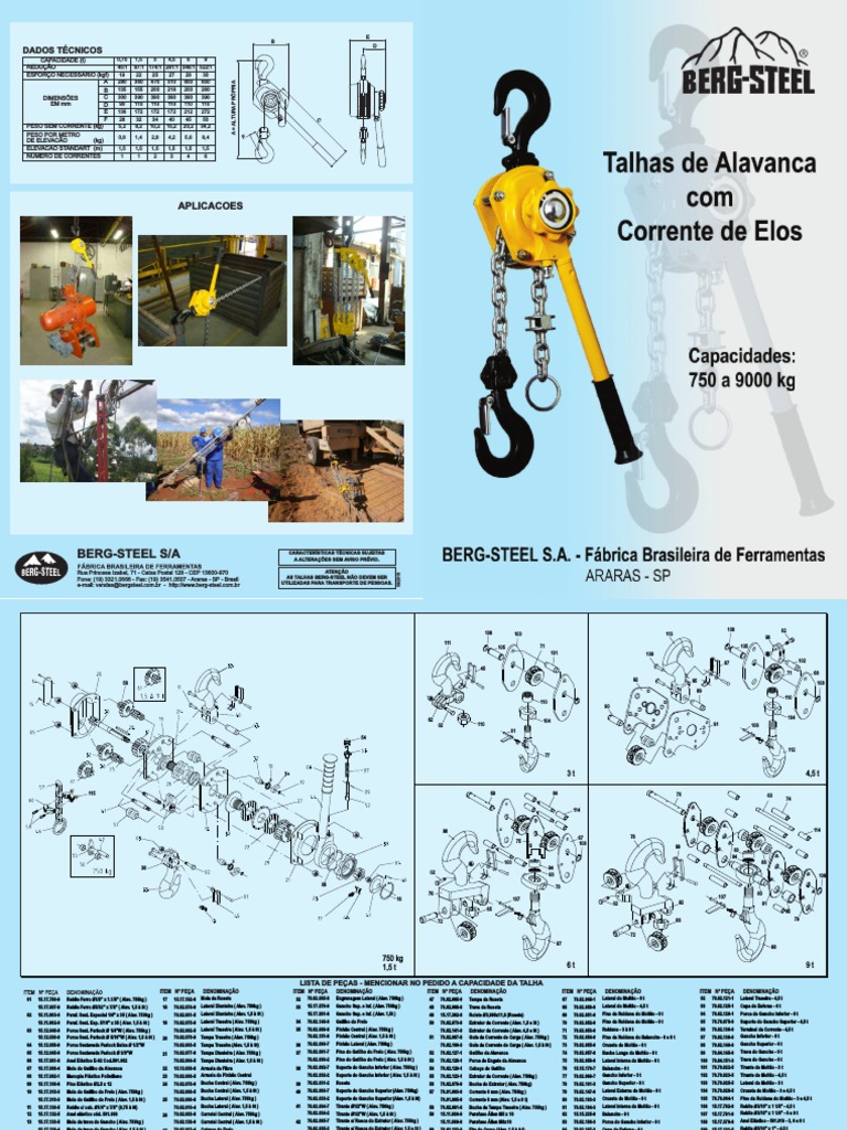 15.17.765-1 Placa de Identificação (Alav. 3t) 29 70.62.014-4 Coroa (Alav. 750 kg) 44 70.62.154-9 Alavanca Curva + Cabo ( Alav. 750kg ) 62 15.18.004-7 Balancim - 3 t 87 70.62.114-2 Trava do Gancho - 4,5 t 112 70.62.021-3 Gancho Inferior - 4,5 t