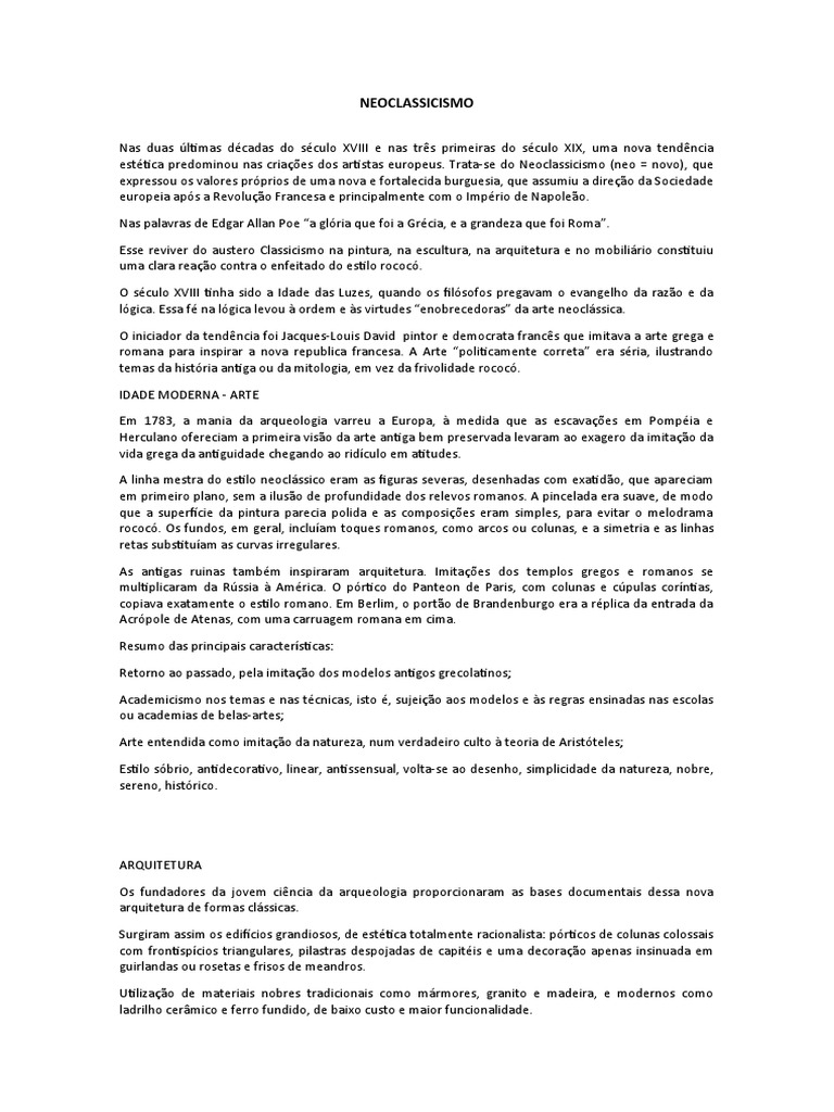 estética predominou nas criações dos artistas europeus. Trata-se do Neoclassicismo (neo = novo), que