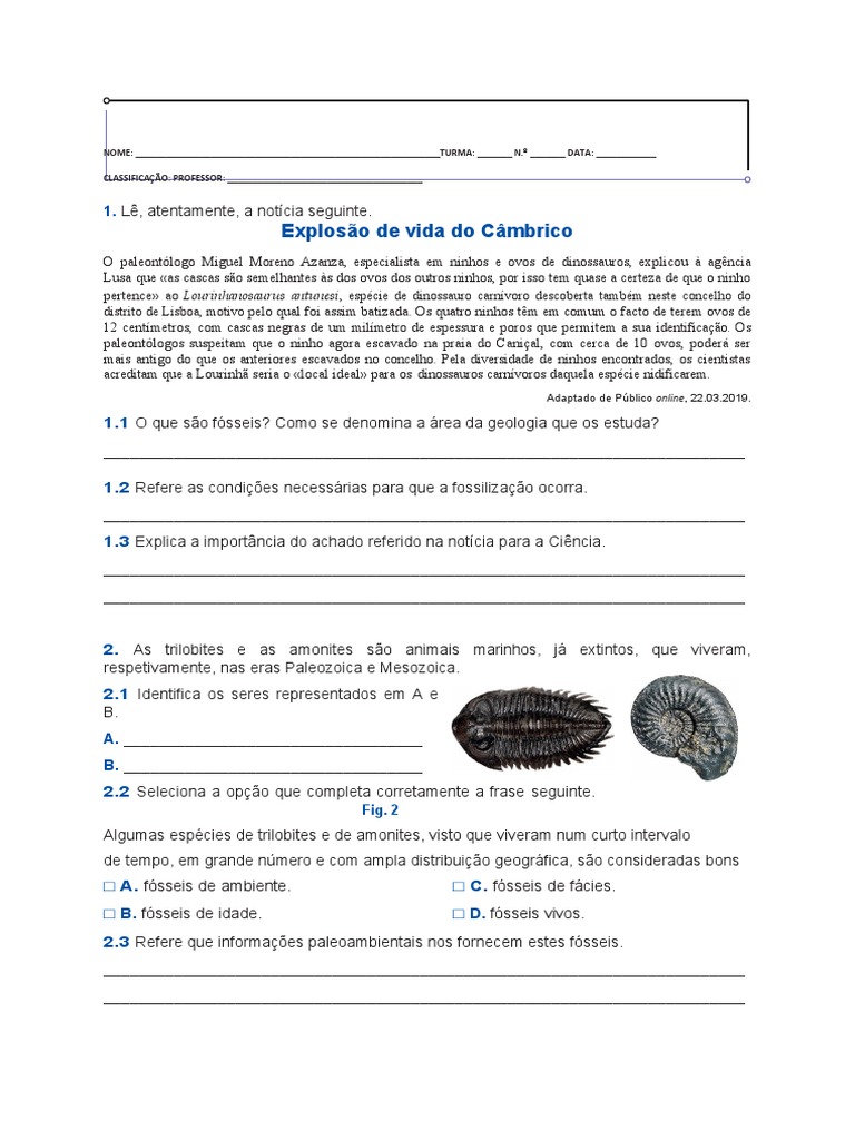 1.1 O que são fósseis? Como se denomina a área da geologia que os estuda?