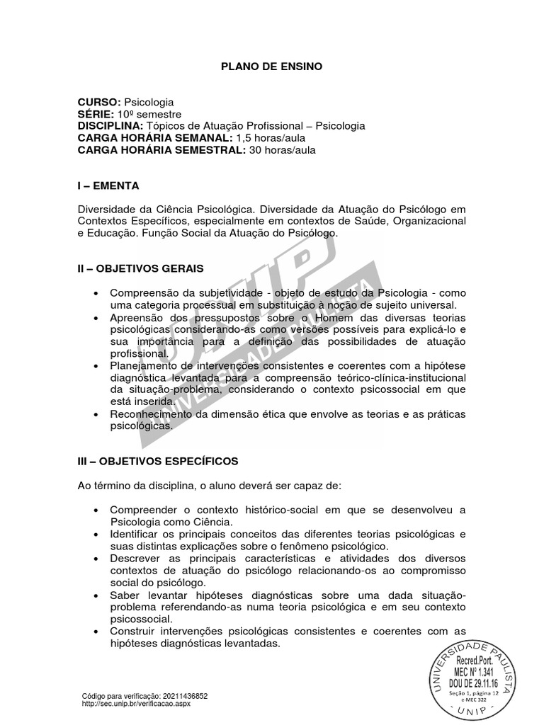 DISCIPLINA: Tópicos de Atuação Profissional – Psicologia