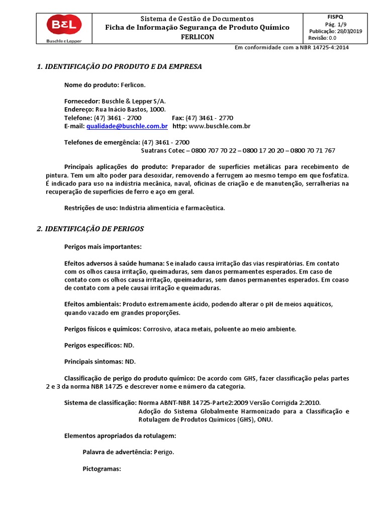 Ficha de Informação Segurança de Produto Químico Publicação: 28/03/2019