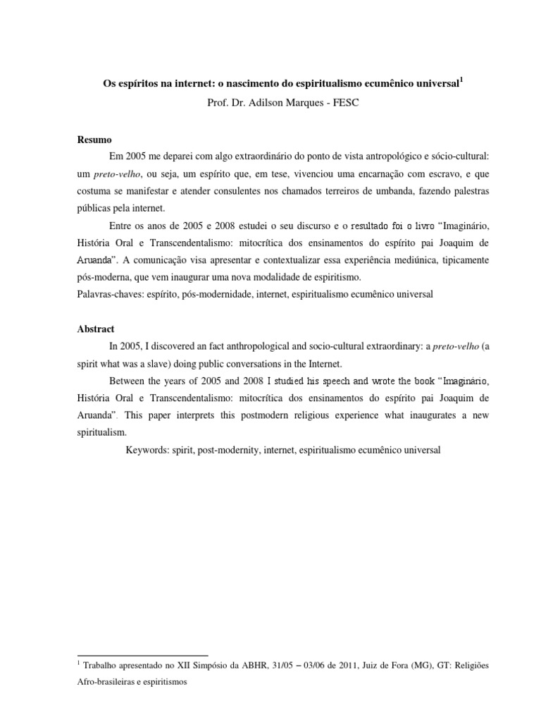 Keywords: spirit, post-modernity, internet, espiritualismo ecumênico universal