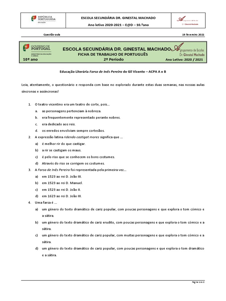 Educação Literária Farsa de Inês Pereira de Gil Vicente – ACPA A e B