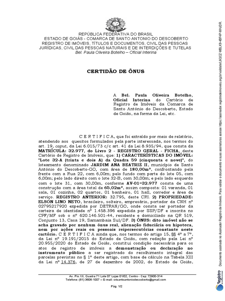 Documento assinado no Assinador Registro de Imóveis. Para validar o documento e suas assinaturas acesse [Link]