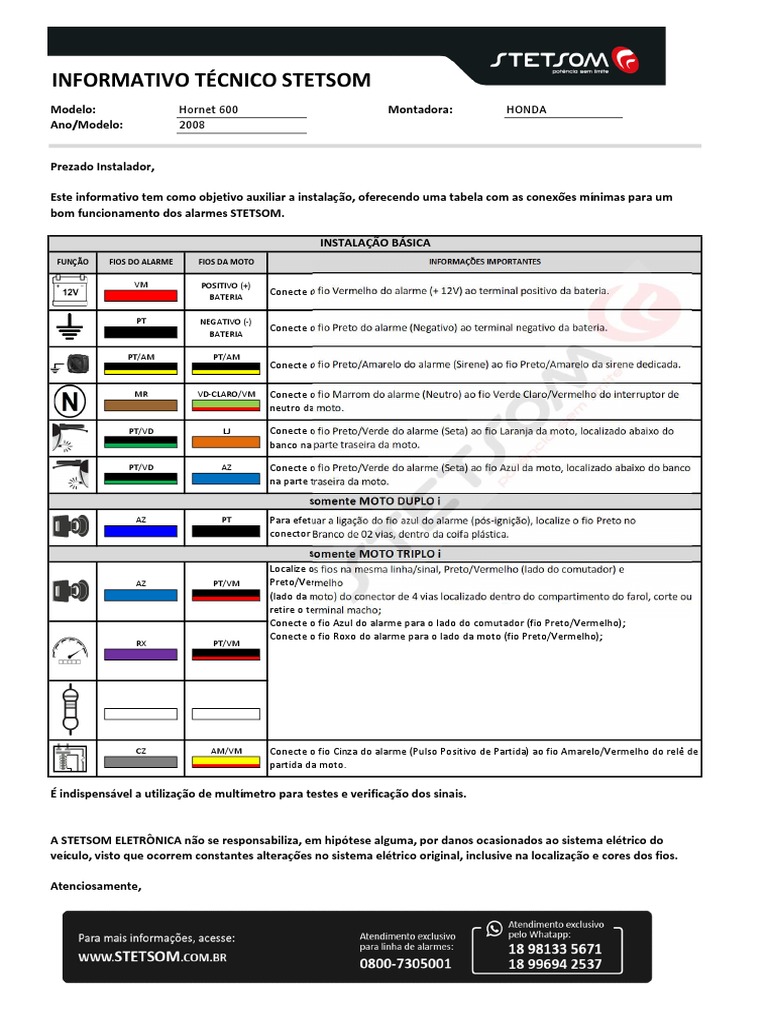 A STETSOM ELETRÔNICA não se responsabiliza, em hipótese alguma, por danos ocasionados ao sistema elétrico do