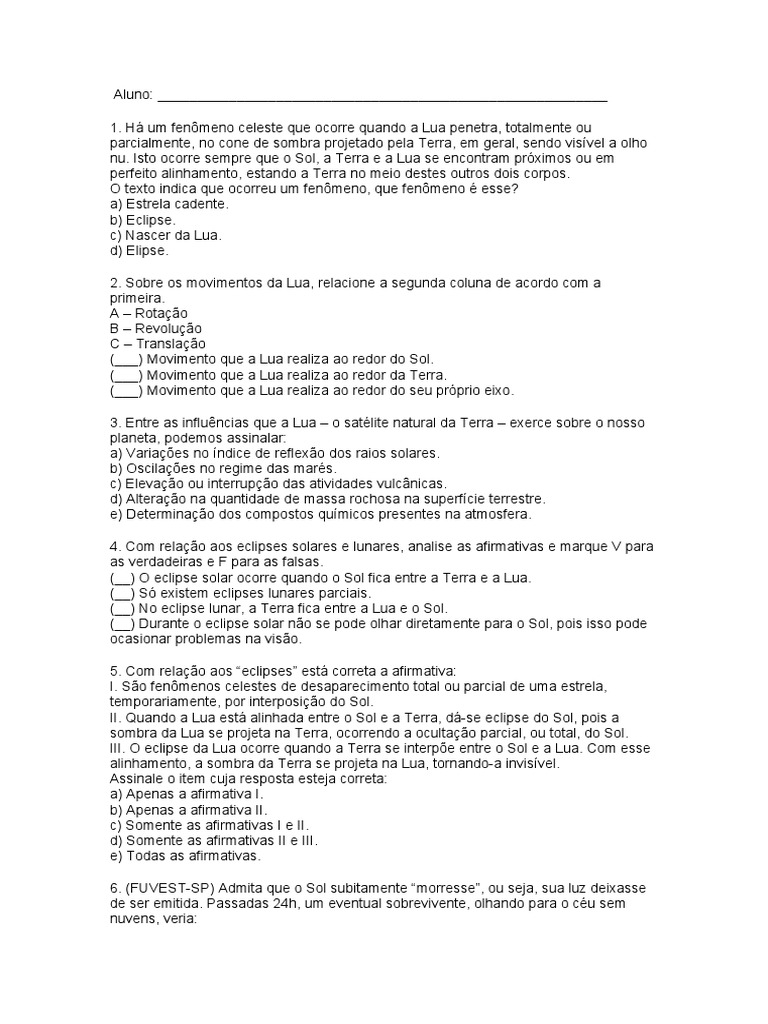 4. Com relação aos eclipses solares e lunares, analise as afirmativas e marque V para