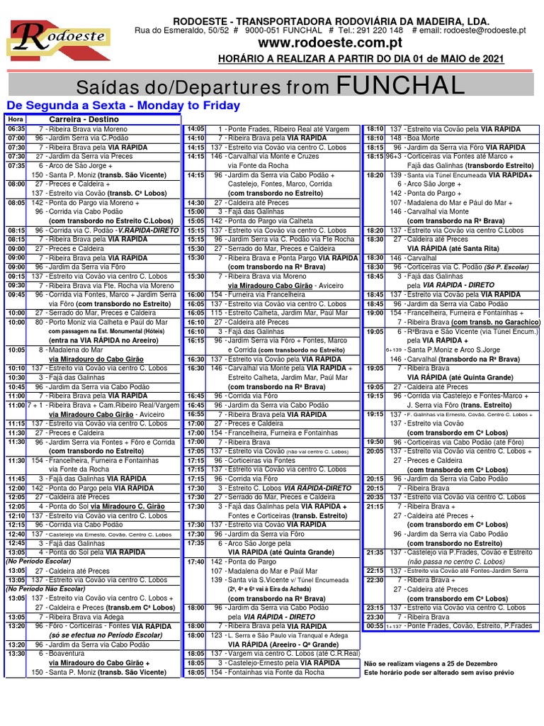 06:35 7 - Ribeira Brava via Moreno 14:05 1 - Ponte Frades, Ribeiro Real até Vargem 18:10 137 - Estreito via Covão pela VIA RÁPIDA