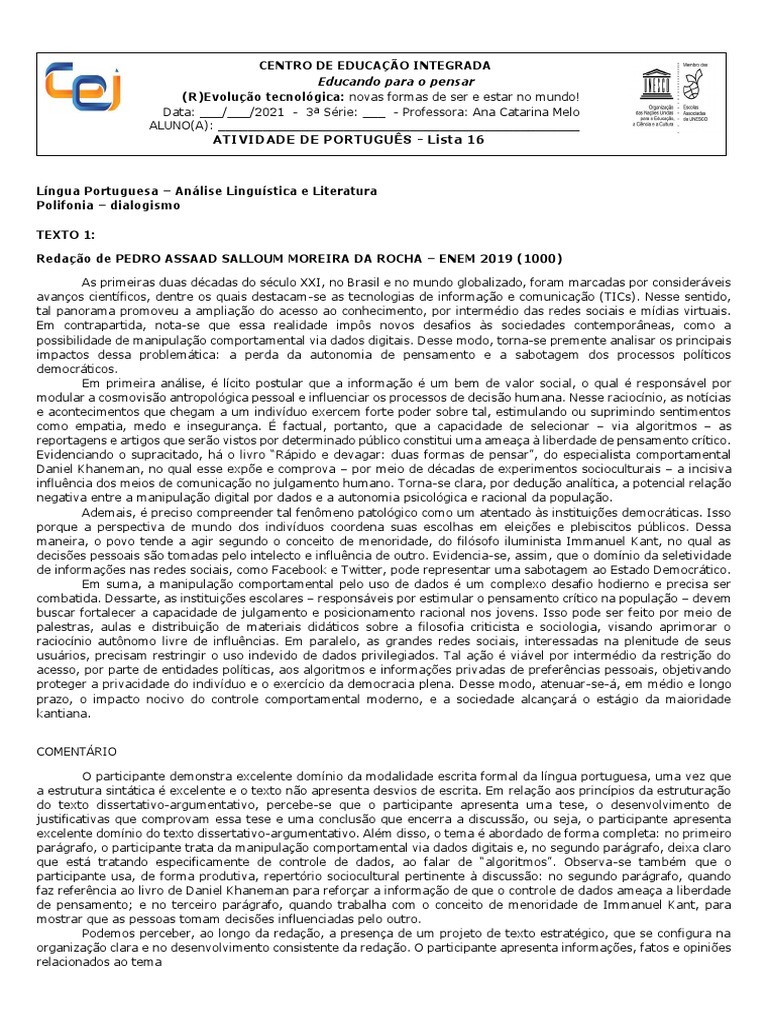Redação de PEDRO ASSAAD SALLOUM MOREIRA DA ROCHA – ENEM 2019 (1000)