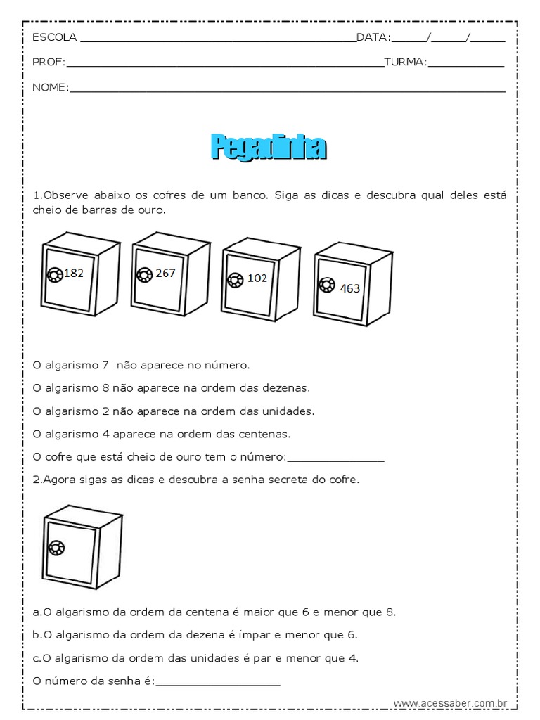 1.Observe abaixo os cofres de um banco. Siga as dicas e descubra qual deles está