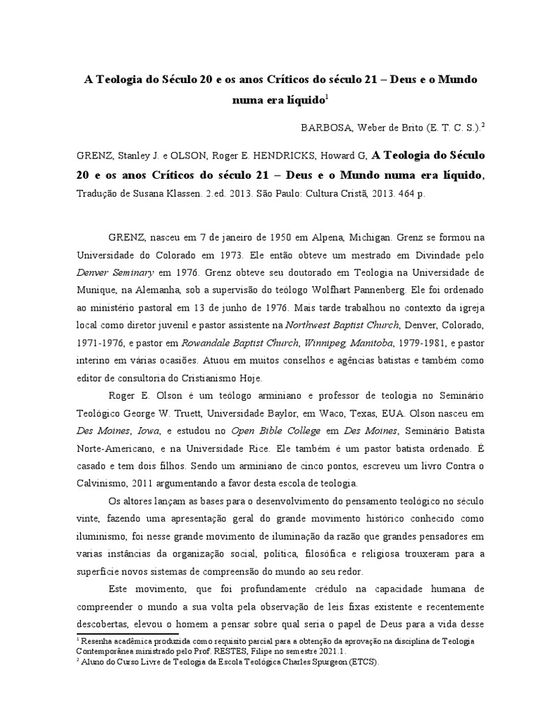Resenha acadêmica produzida como requisito parcial para a obtenção da aprovação na disciplina de Teologia
