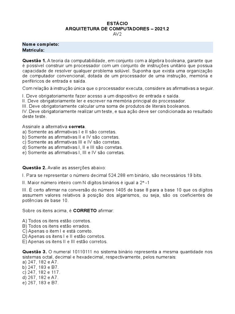 Questão 1. A teoria da computabilidade, em conjunto com a álgebra booleana, garante que