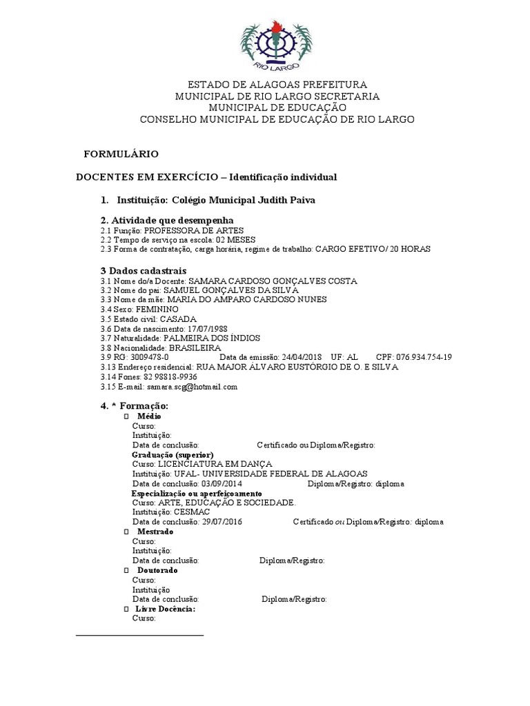 3.1 Nome do/a Docente: SAMARA CARDOSO GONÇALVES COSTA