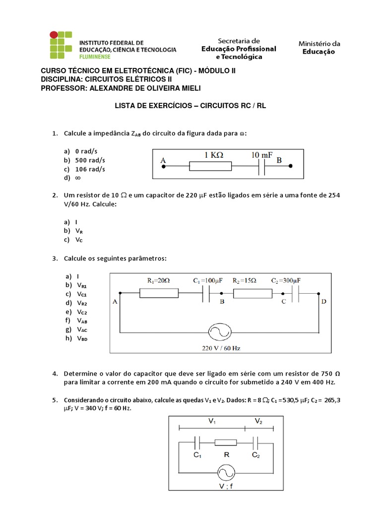 2. Um resistor de 10 e um capacitor de 220 F estão ligados em série a uma fonte de 254