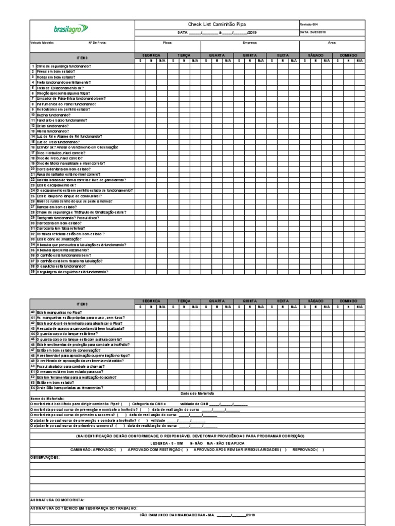 Check List Caminhão Pipa Revisão 004