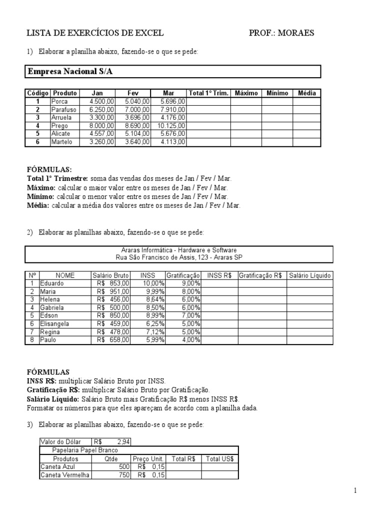 LISTA DE EXERCÍCIOS DE EXCEL PROF.