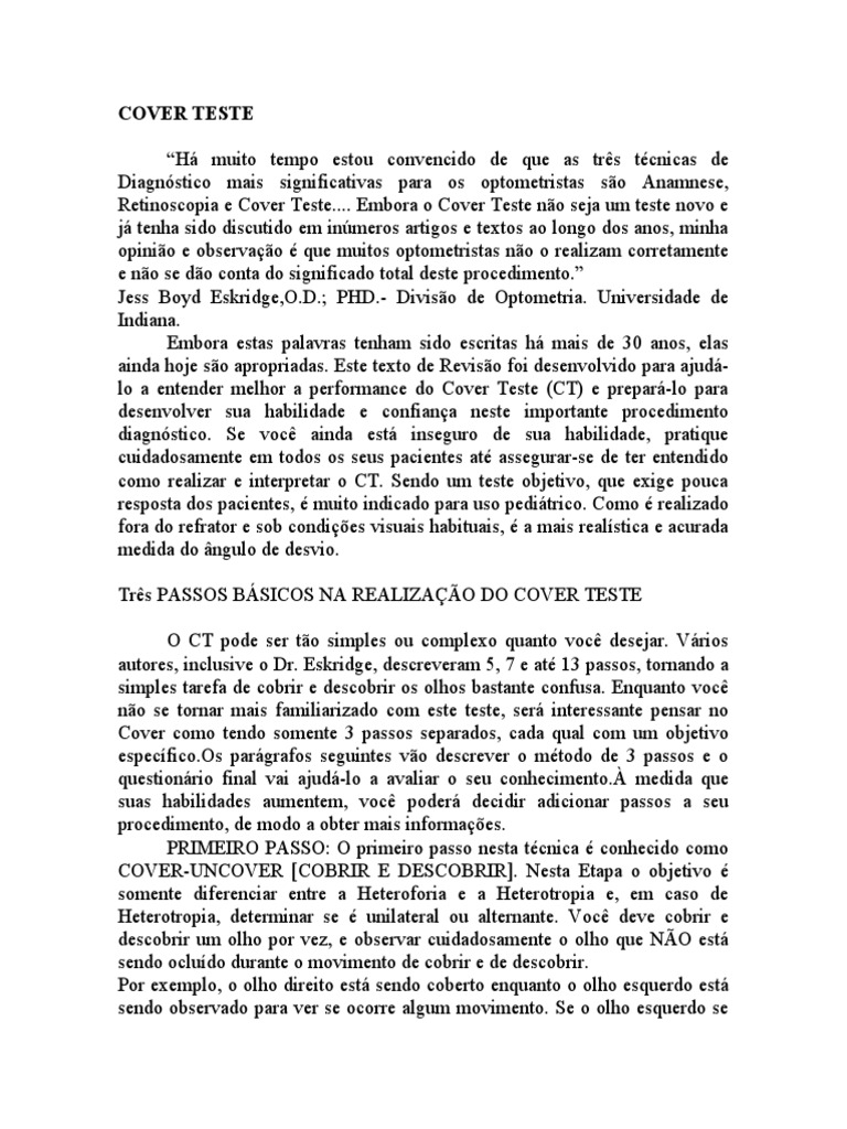 Retinoscopia e Cover Teste.... Embora o Cover Teste não seja um teste novo e