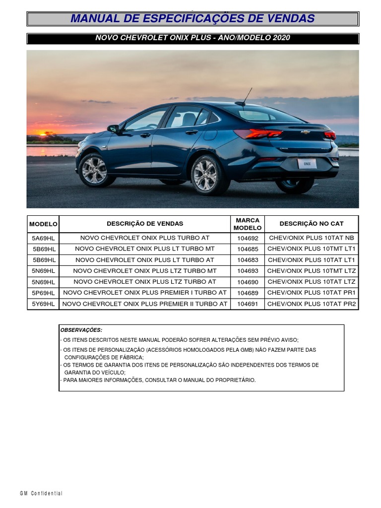NOVO CHEVROLET ONIX PLUS - ANO/MODELO 2020 TURBO AT LT TURBO LTZ TURBO PREMIER TURBO
