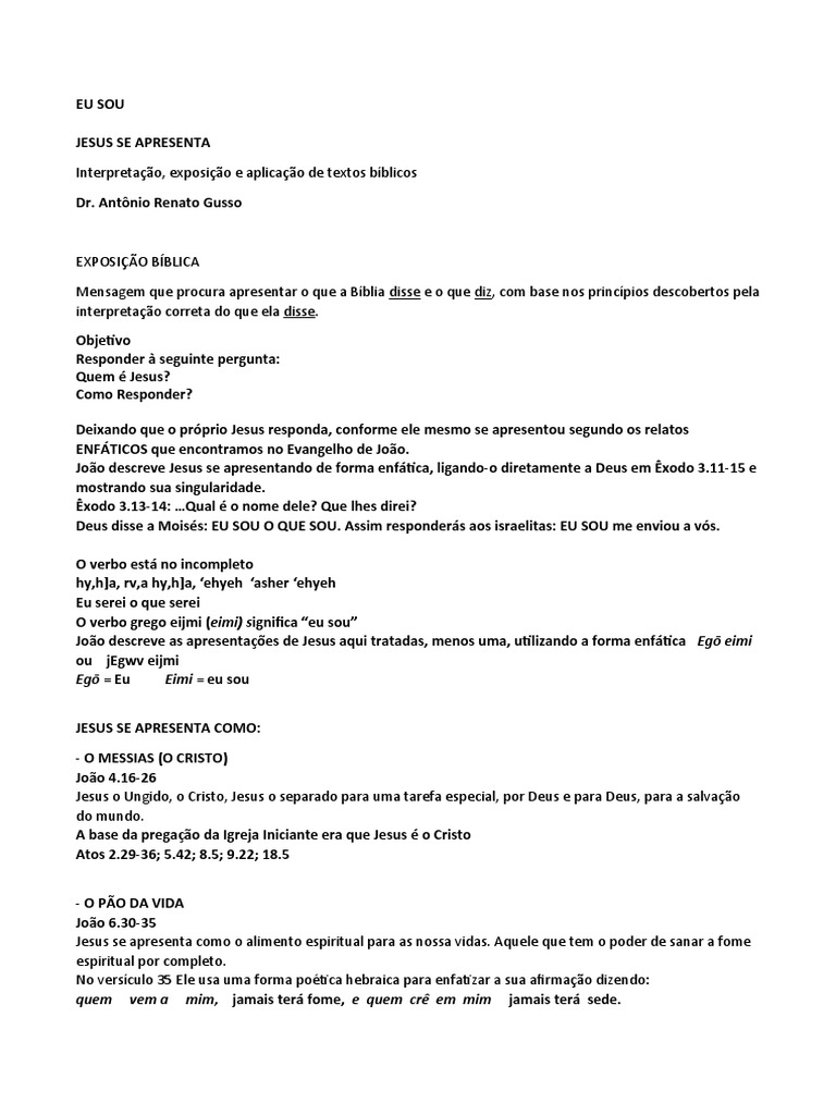 EXEMPLO DE INTERPRETAÇÃO, EXPOSIÇÃO E APLICAÇÃO COM BASE EM TEXTO QUE JESUS SE APRESENTA