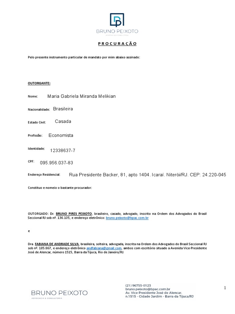 OUTORGADO: Dr. BRUNO PIRES PEIXOTO, brasileiro, casado, advogado, inscrito na Ordem dos Advogados do Brasil