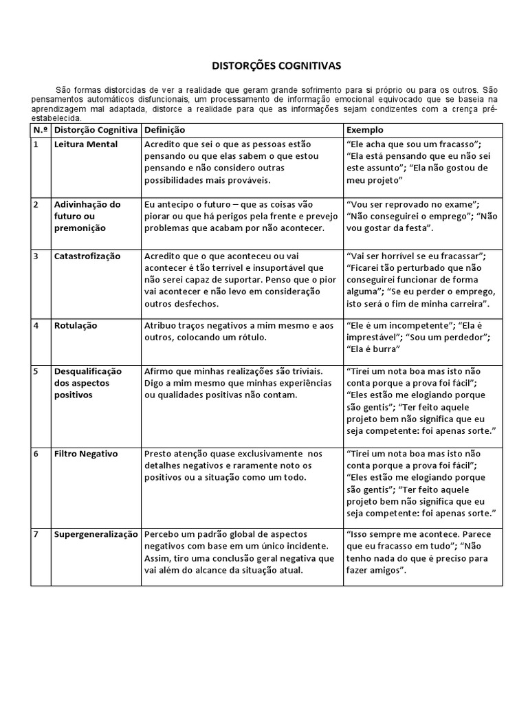 3 Catastrofização Acredito que o que aconteceu ou vai “Vai ser horrível se eu fracassar”;