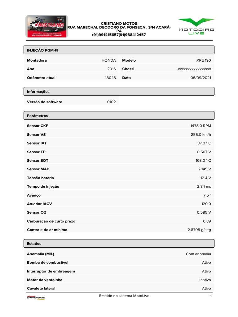 Odômetro atual 43043 Data 06/09/2021